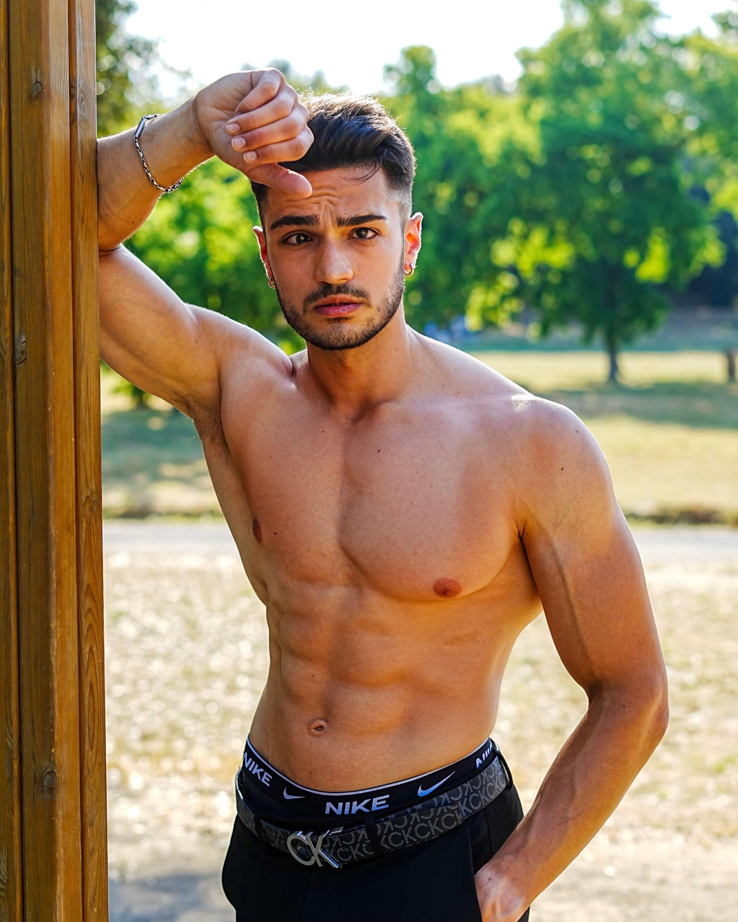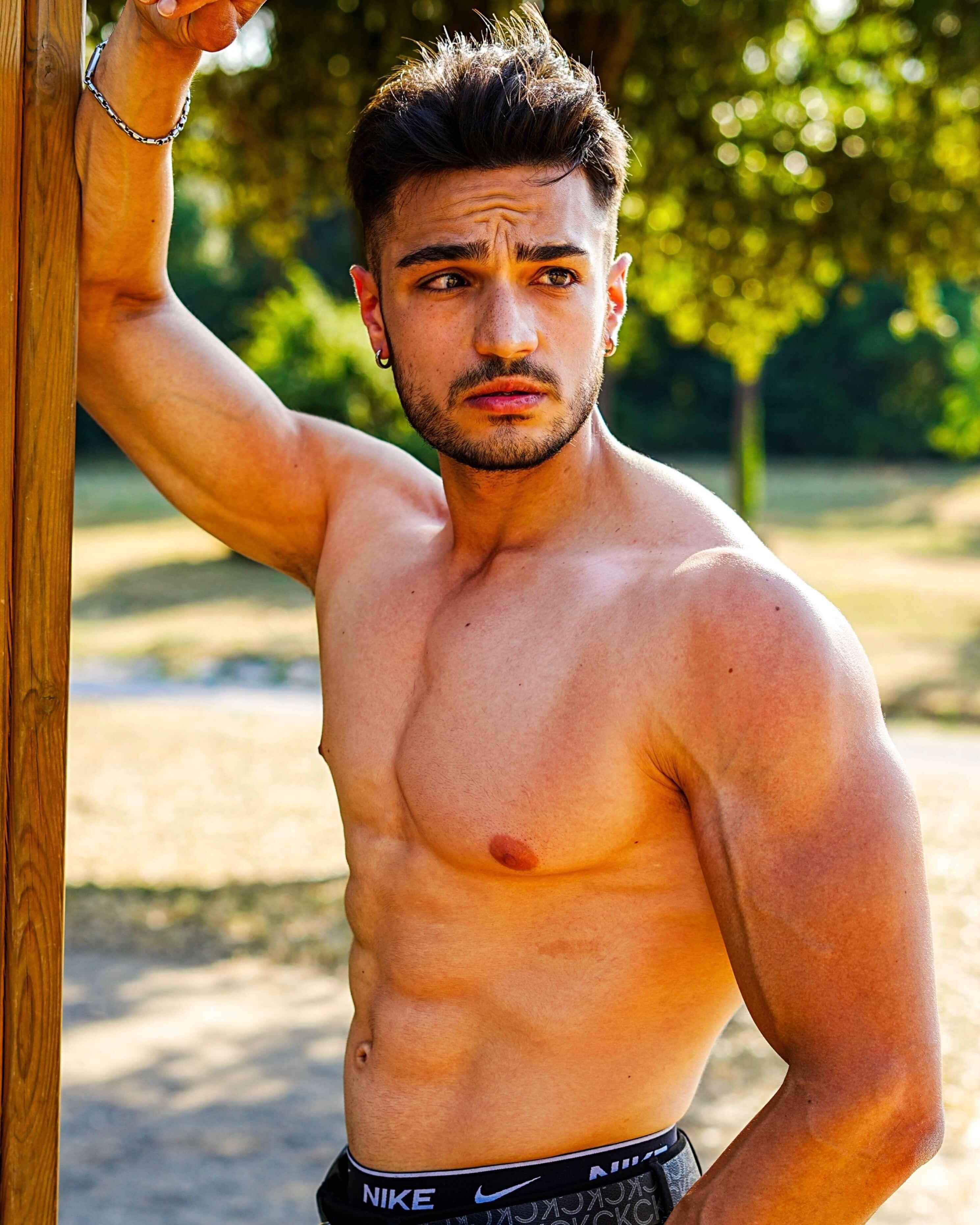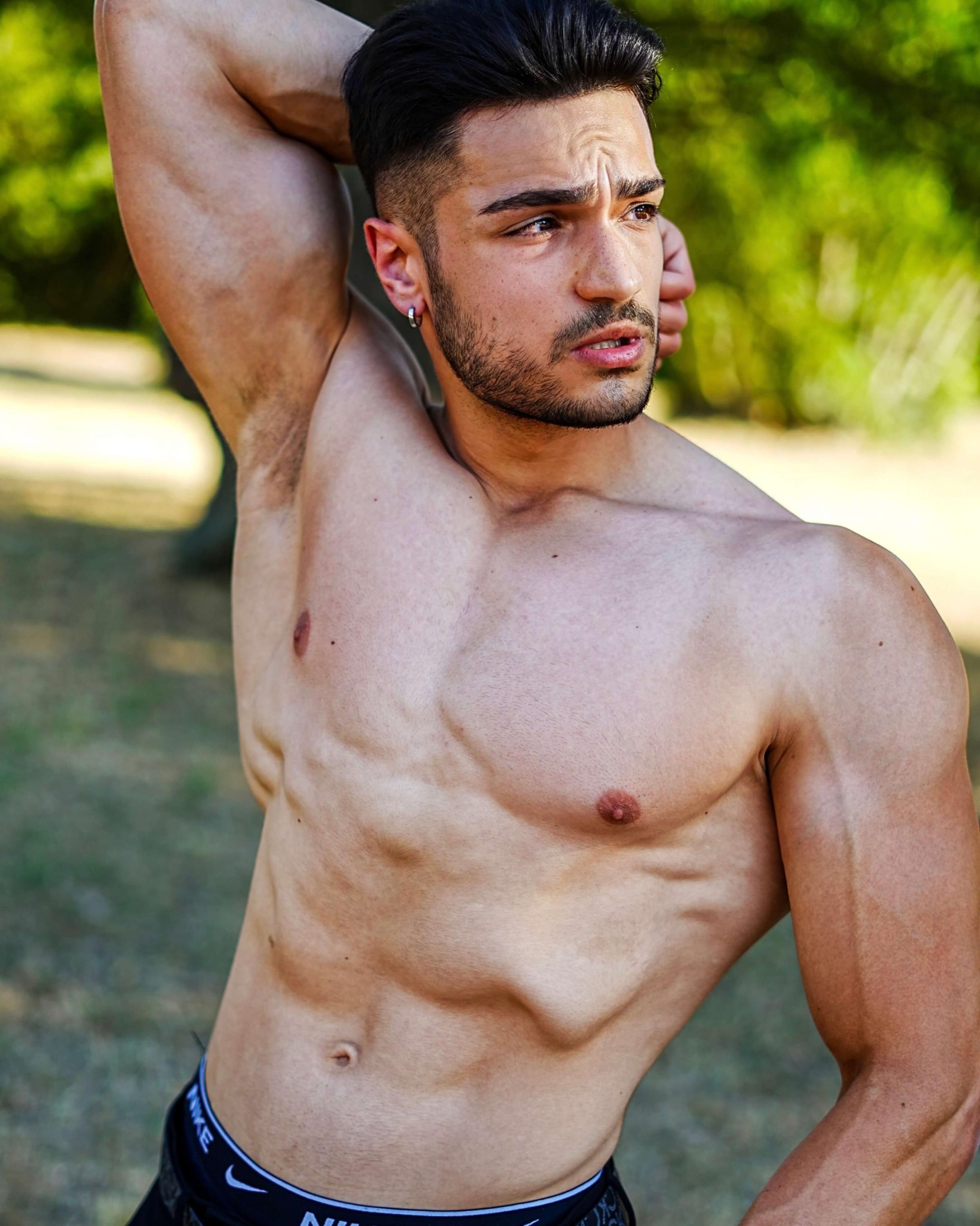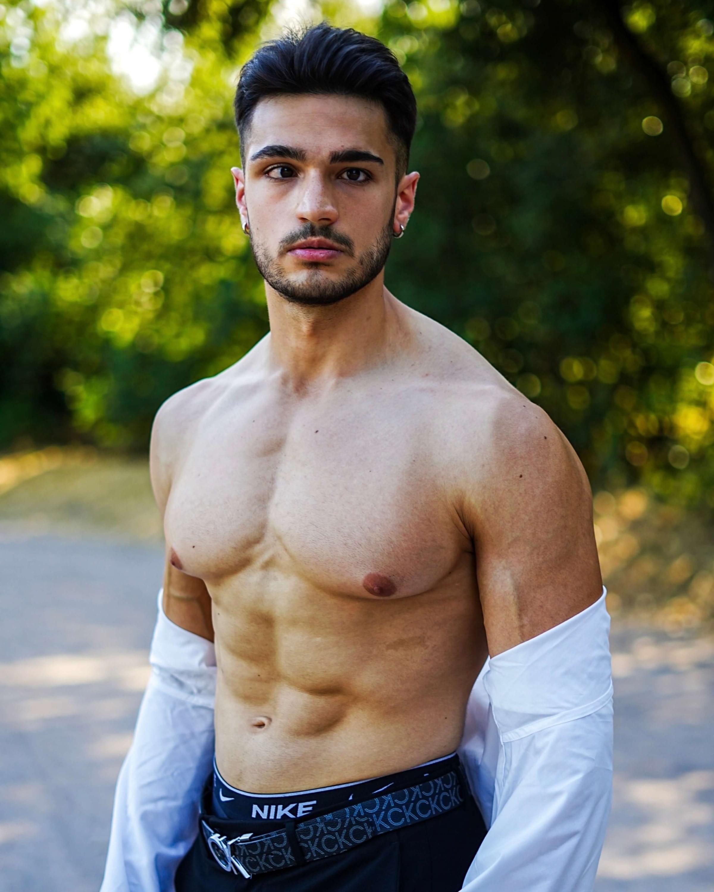 Un fisico muscoloso, marmoreo, naturale con addome scolpito, braccia grosse e spalle larghe.
